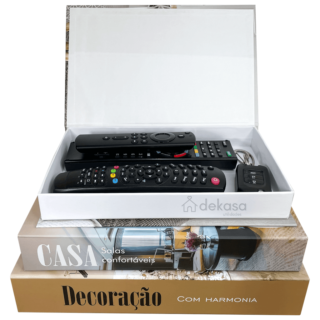 O Livro Decorativo é ótimo para racks, mesas de centro, aparadores, estantes e todo cantinho que quiser. Ao mesmo tempo, organiza e armazena objetos que não precisa estar a vista, como controles remotos, carteiras, papeis, maquiagens, joias etc.