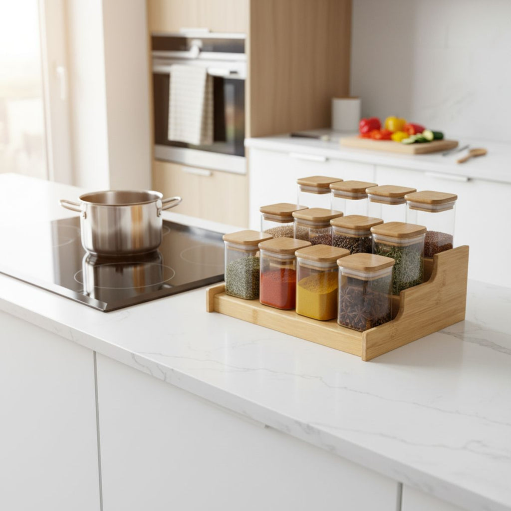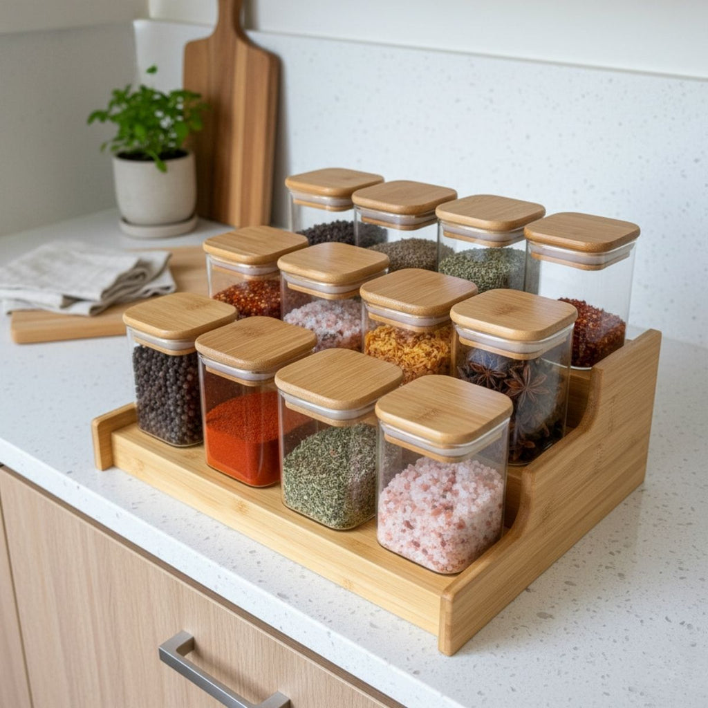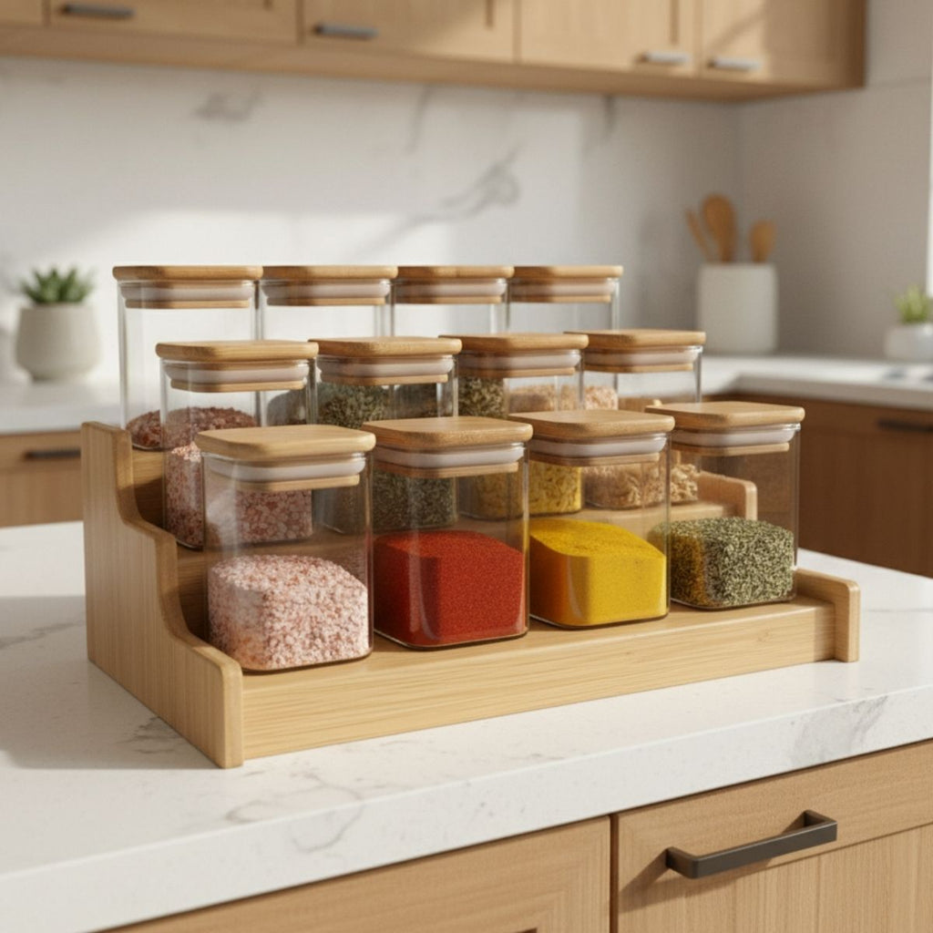 Esse é o KIT de potes de condimentos quadrado flat com tampa de bambu + Base de Bambu.