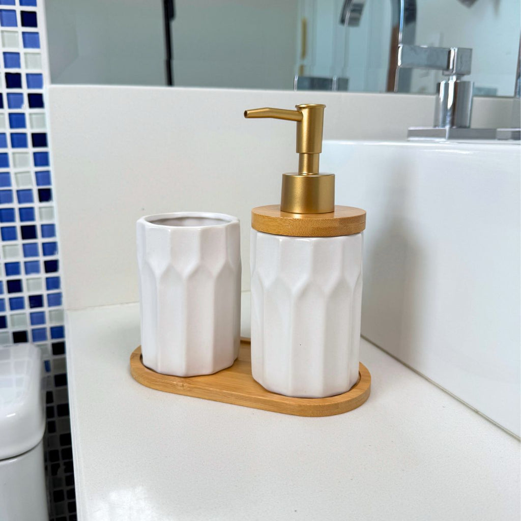 - Dispenser para sabonete líquido: Com detalhes texturizados e acabamento em bambu natural, oferece um visual premium e funcional.