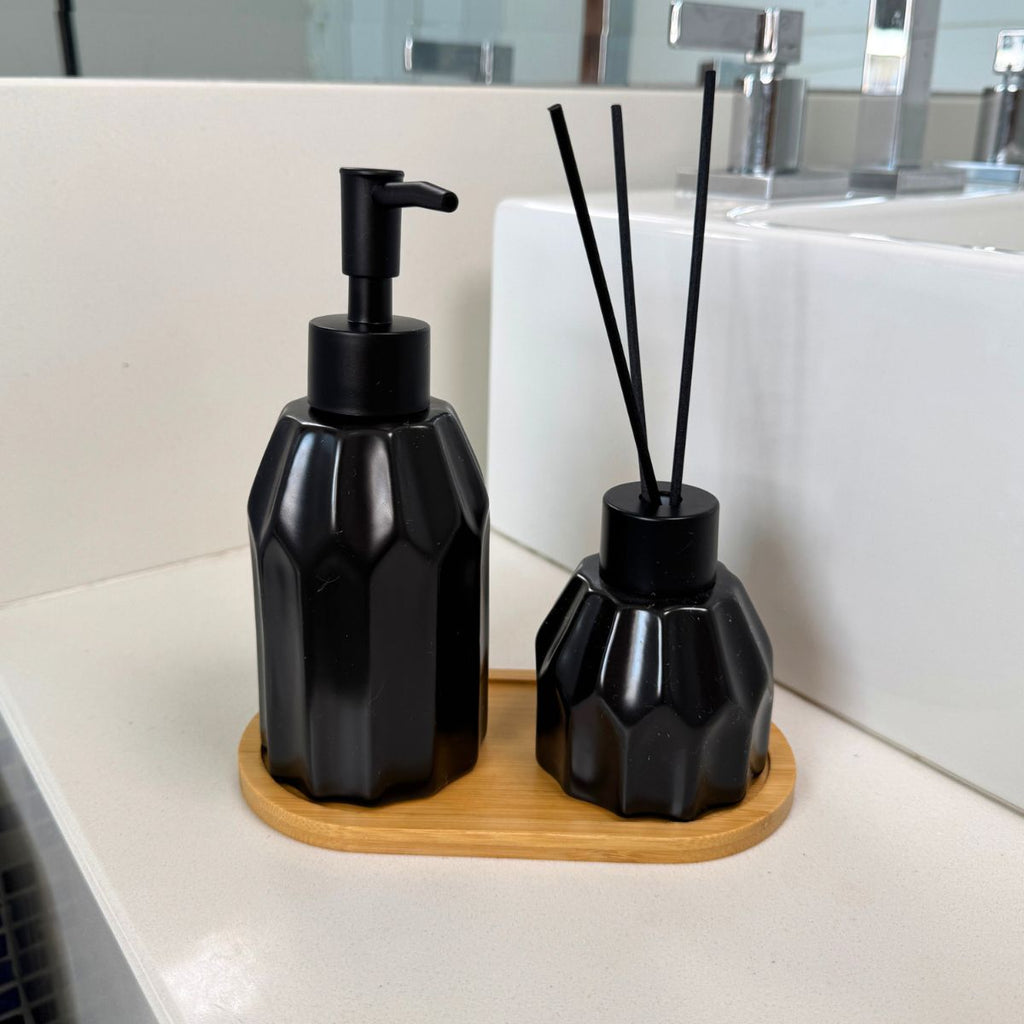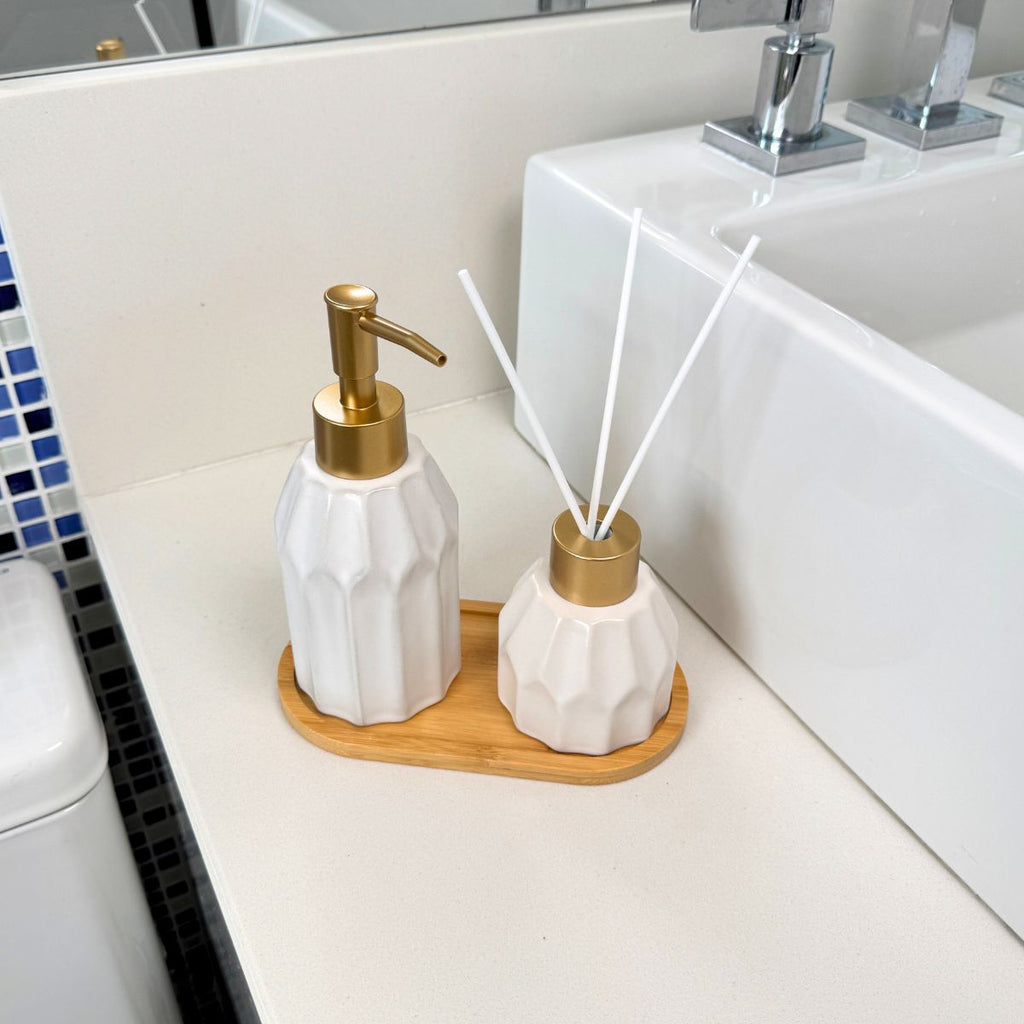 Kit Banheiro Aromas 3 Peças - Conjunto Dispenser e Aromatizador em Porcelana com Bandeja em Bambu