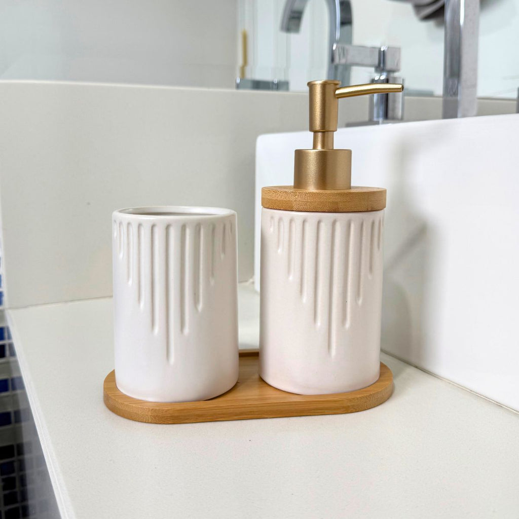Kit Banheiro lavabo Drip - Conjunto Porcelana Base Bambu Saboneteira Porta Escova 3 Peças