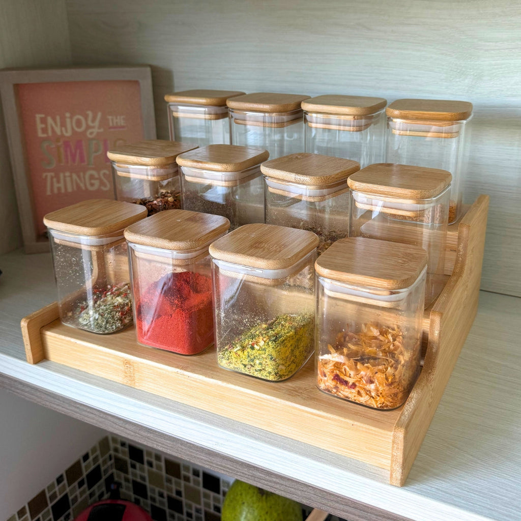 Kit VitaBela Premium - 12 porta temperos herméticos em vidro com tampa em bambu natural. A combinação perfeita entre funcionalidade e design clean que você sempre buscou.